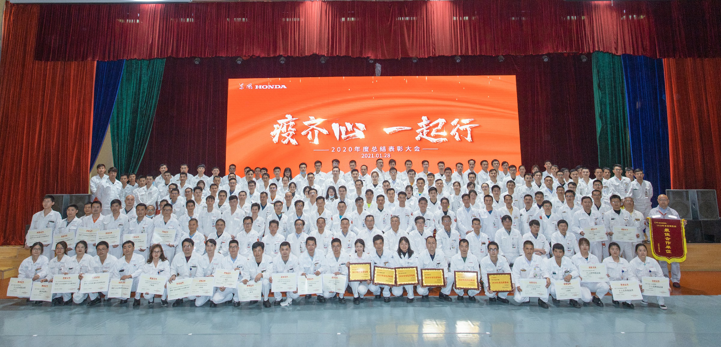 2021年1月28日,公司召开以“疫齐心 一起行”为主题的2020年度总结表彰大会,受表彰人员代表、先进集体代表、正副科长及以上管理者、党工团系统干部等200余人齐聚东本嘉园俱乐部。